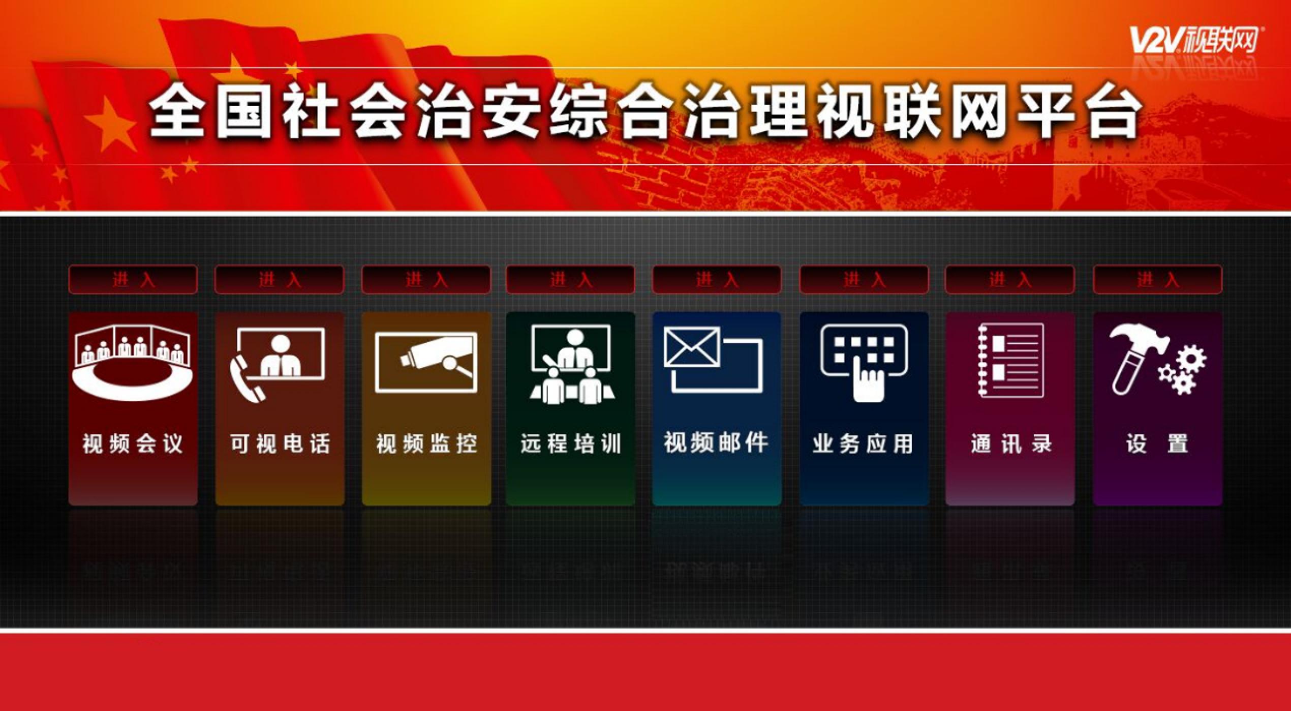 綜治視聯(lián)網(wǎng)是運(yùn)用“V2V視聯(lián)網(wǎng)”、“統(tǒng)一視頻”、“視頻云計(jì)算”等多項(xiàng)技術(shù),采用多項(xiàng)專利技術(shù),針對(duì)全新建設(shè)思路提出的全新的視頻通訊平臺(tái)。覆蓋全國(guó)的視頻會(huì)議的基本功能實(shí)現(xiàn);全高清、全兼容的視頻通訊系統(tǒng);可以與現(xiàn)有的監(jiān)控、會(huì)議系統(tǒng)實(shí)現(xiàn)互聯(lián)互通;與國(guó)家、其他省市視聯(lián)網(wǎng)平臺(tái)互聯(lián)互通;實(shí)現(xiàn)一個(gè)平臺(tái)下實(shí)現(xiàn)多功能的特性,節(jié)省開支;實(shí)現(xiàn)可成長(zhǎng)、可擴(kuò)充的應(yīng)用模式,支持“橫到邊、縱到底”的擴(kuò)容模式。