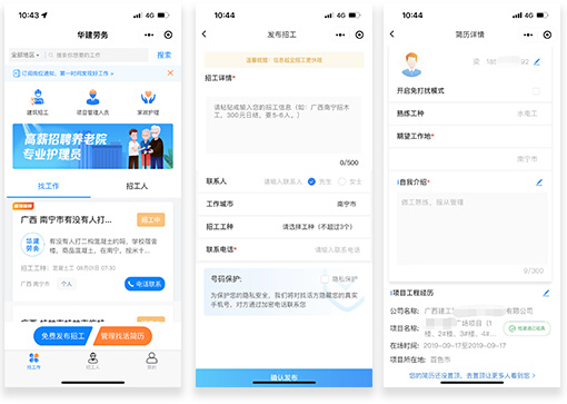 華建勞務小程序是中國東信開發(fā)建設的一站式高效招工找活輕量級服務平臺,與行業(yè)平臺桂建通、云建寶、新薪通、慧康養(yǎng)、智桂通對接,工人實名認證后可授權(quán)華建勞務平臺獲取相關(guān)行業(yè)平臺認證的工作履歷,快速形成真實、可信的個人簡歷;用工方在華建勞務小程序發(fā)布招工信息一次,可同步到華建勞務的多個信息分發(fā)渠道,覆蓋用戶規(guī)模超6000萬。